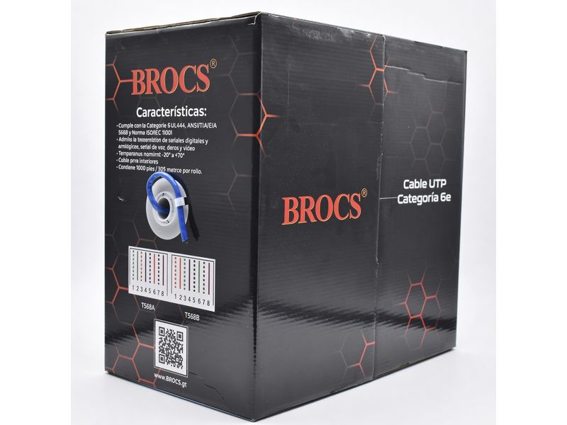 El cable UTP BROCS CAT 6 para interiores está diseñado para redes de alto rendimiento y mayor estabilidad en la transmisión. Fabricado en calibre 23 AWG, cumple con los estándares UL444, ANSI/TIA/EIA 568B e ISO/IEC 11801, garantizando una instalación confiable y certificable. Admite la transmisión de señales digitales y analógicas, así como voz, datos y video, ofreciendo un desempeño óptimo en entornos interiores y soportando rangos de temperatura de -20 °C a +70 °C.