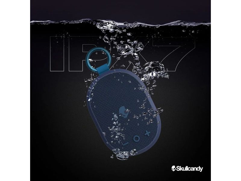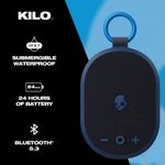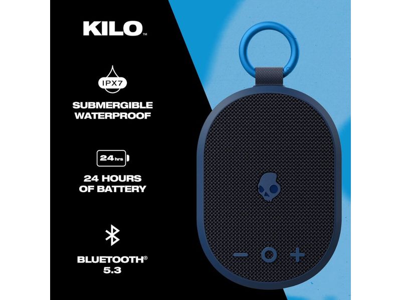 Función de emparejamiento de dos altavoces Kilo de forma inalámbrica. incluye un mosquetón de aluminio anodizado que le permite sujetar el altavoz a bicicletas, bolso o mochila. IPX7 a prueba de agua (se puede sumergir hasta 1 metro de agua durante un máximo de 30 minutos), duración de la batería 24 horas, modo estéreo.