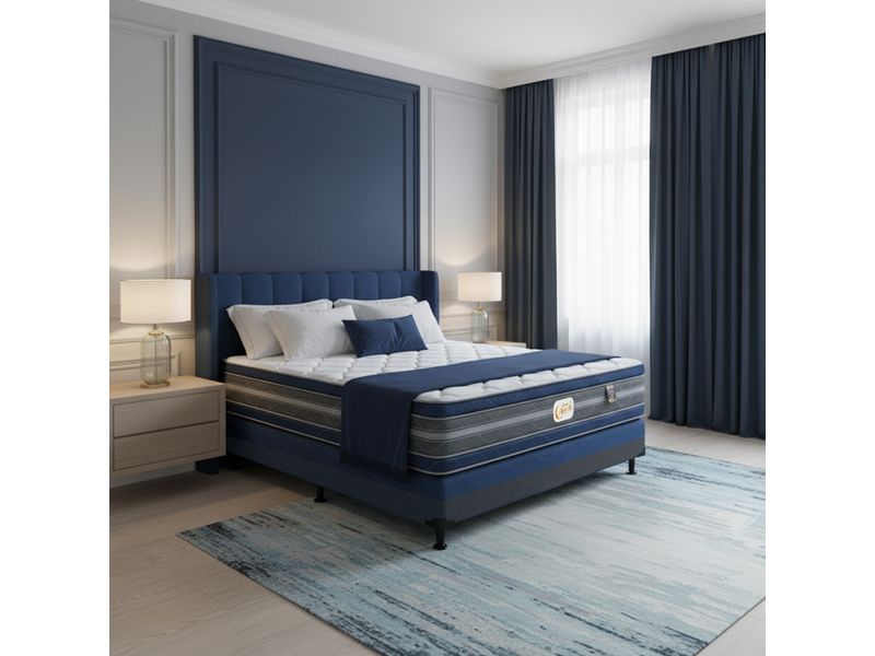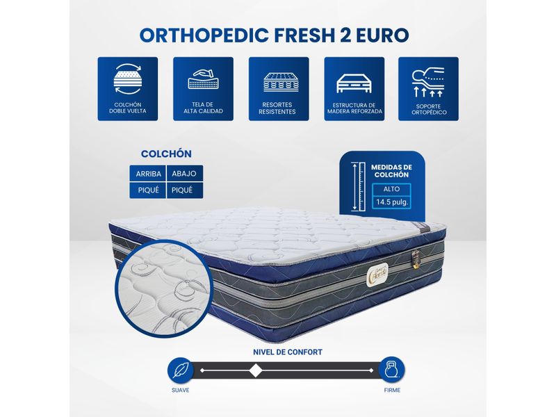 Colchón doble vuelta fabricado con tela PIQUE, soporte ortopédico base con estructura de madera reforzada y acolchonada, 25% más resortes que garantizan tiempo de vida útil. Altura del colchón 16.5 in, medidas 2.0 x 2.0 mts, nivel de confort semi firme