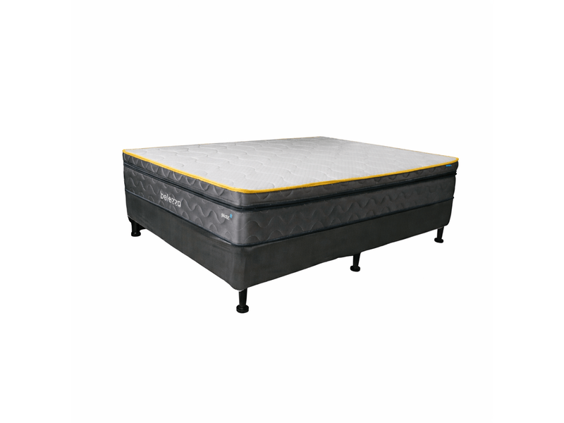 Cama King Pluzz by Belezza con tecnología Antistatic, diseñada para mejorar la calidad del descanso al reducir los niveles de estrés acumulado en el cuerpo. Su tela con fibras y filamentos metálicos canaliza las cargas eléctricas fuera del organismo, promoviendo una mayor producción de melatonina y un sueño más profundo y reparador.