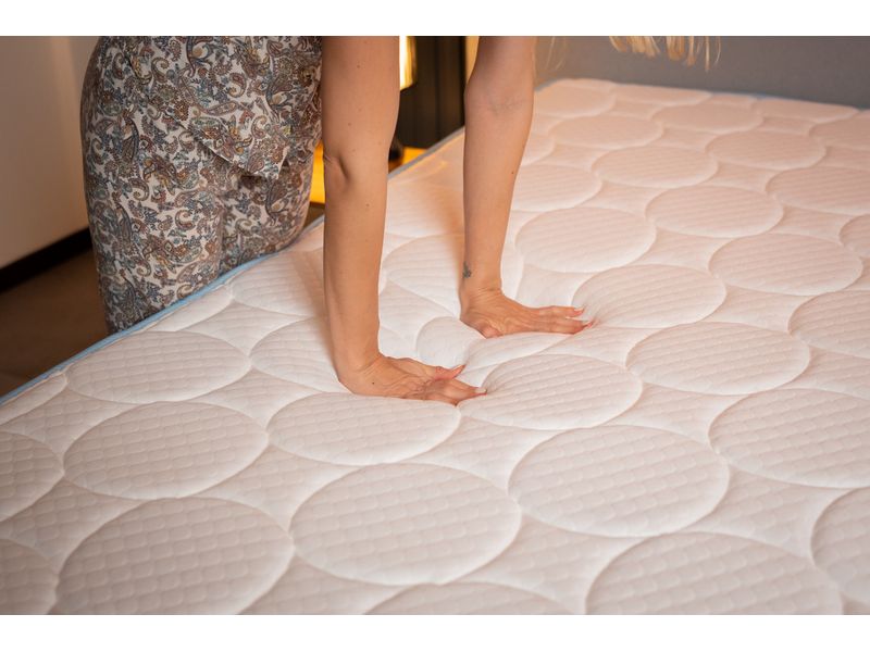 Cama Matrimonial Pluzz D by Belezza, diseñada con tela Freeze, una tecnología que mantiene la superficie fresca y suave durante toda la noche. Sus fibras tratadas ayudan a disipar el calor corporal, reduciendo las molestias de los climas calurosos y favoreciendo un descanso más fresco y cómodo.