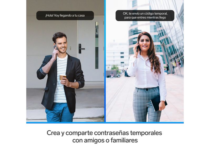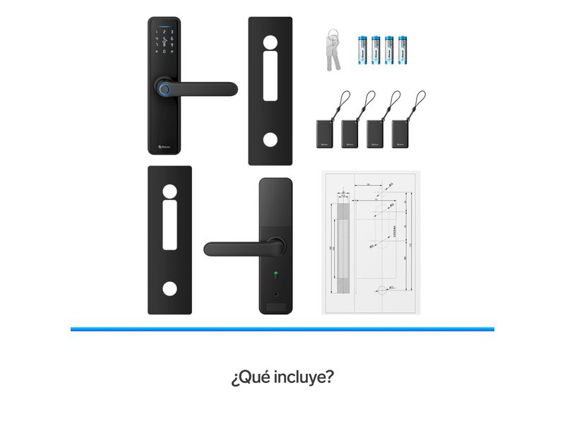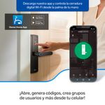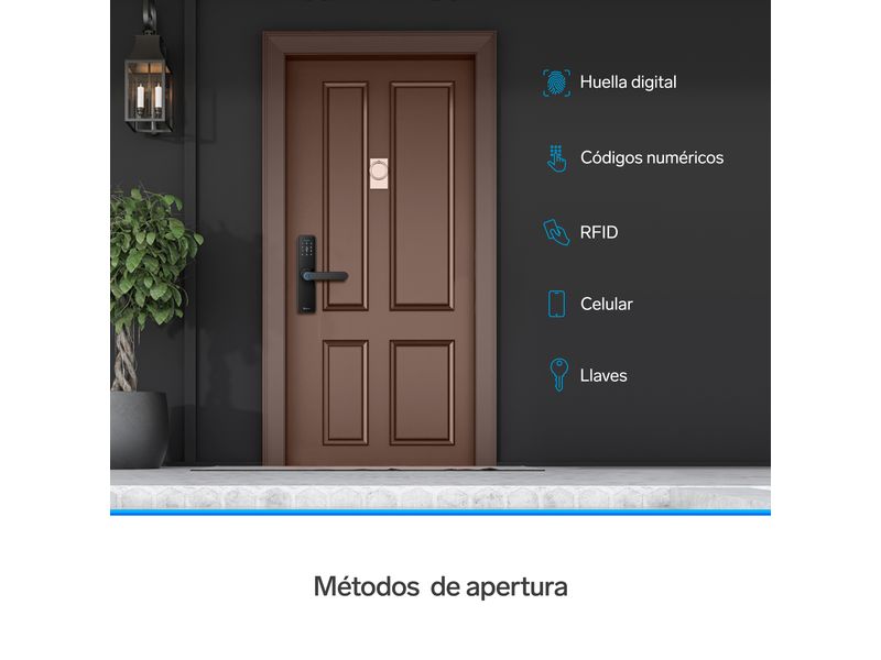 Celular: Puedes dar el acceso, desde donde estés. RFID: La cerradura incluye 2 tarjetas RFID con las que se puede abrir al acercarlas. Permite registrar hasta 100 tarjetas1. Huella: Abre con tan solo colocar tu dedo en la manija. El equipo tiene capacidad para almacenar hasta 100 huellas. Códigos: Genera códigos de 6 a 8 dígitos que pueden ser personalizados y dinámicos con duración de 5 min o con validez de fecha y hora de inicio y término, para que los compartas con personas de tu confianza. Es posible registrar hasta 100 códigos. Llave: Tiene el sistema tradicional de apertura por llave física. El fresado lateral de la llave y el sistema antisegueta del cerrojo minimizan el riesgo de clonación y vandalismo. El equipo incluye 2 llaves.