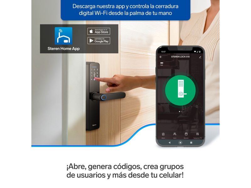 App Steren Home: Adminístrala con tu celular, desde donde es posible ver registros de acceso, generar códigos temporales de acceso, compartir el control con otras personas y más.