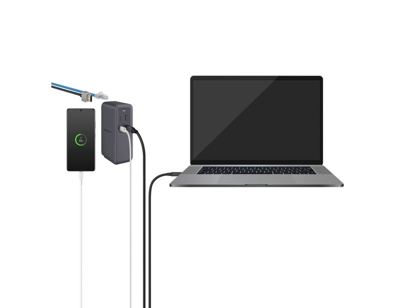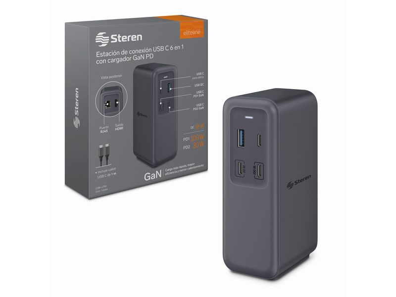 ¡Saca todo el potencial a la conexión USB C! Conecta esta estación (Docking station) a tu dispositivo con puerto USB C y aprovecha todas las funciones1 que ofrece: 2 puertos USB C Power Delivery, uno de 100 W y otro de 30 W para recargar equipos como tu laptop, videojuegos portátiles o una tablet. 1 puerto USB C de datos con alta velocidad de transmisión, para conectar memorias o discos duros externos. 1 puerto USB QC para recargar dispositivos como tu celular, bocinas o audífonos. 1 puerto HDMI para transmitir audio y video a una pantalla (soporta hasta 4K 30 Hz). 1 puerto RJ45 Gigabit Etnernet para brindar una conexión a Internet más estable y confiable a tu laptop, con velocidad de hasta 1 000 Mbps. Tecnología GaN (Nitruro de Galio): Esta característica ofrece una carga con menor riesgo de calentamiento del equipo, esto se traduce en una mayor eficiencia, por lo que la energía se aprovecha aún más, haciendo que la carga sea más rápida. La compatibilidad de las funciones del puerto USB C depende de las características habilitadas por el fabricante del equipo fuente conectado. Descripción técnica
