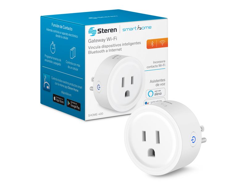 App Steren Home: Se administra por medio de nuestra app Steren Home, desde donde puedes añadir dispositivos inteligentes Bluetooth a la función Gateway, controlar el encendido y apagado del contacto de forma instantánea o por programación de horarios, hacer rutinas, compartir el control con otros usuarios y mucho más.