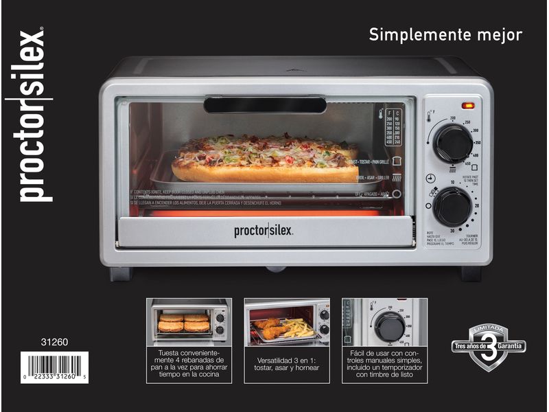 El Horno Tostador Proctor Silex PS31260 es la opción ideal para quienes buscan practicidad y versatilidad en la cocina. Con capacidad para 4 rebanadas, este horno combina funciones de tostador y rostizador, permitiéndote preparar desde tostadas rápidas hasta pequeños horneados con excelente resultado.