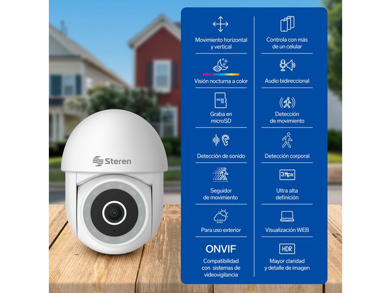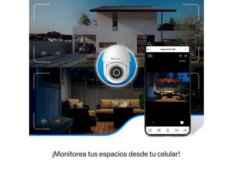 Con esta mini cámara de seguridad Wi-Fi tipo domo para exterior, monitorea cualquier lugar a través de tu celular. Conéctala por Wi-F a tu módem y configúrala con nuestra app Steren Home (disponible en App Store* y Google Play*), para controlar su movimiento y todas sus funciones.