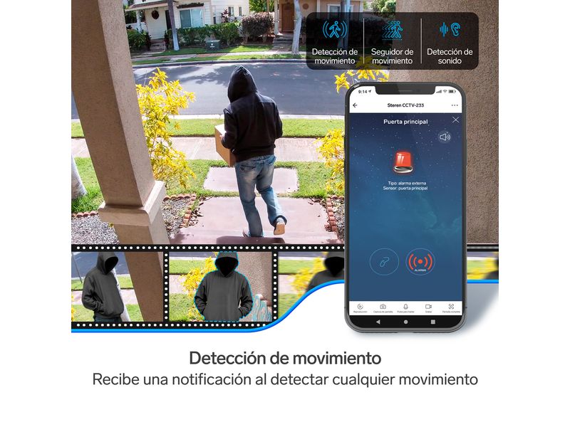 Detección de movimiento y sonido: Recibe una notificación en tu celular en caso de actividad, ya sea por el desplazamiento de algo o alguien o por algún ruido.