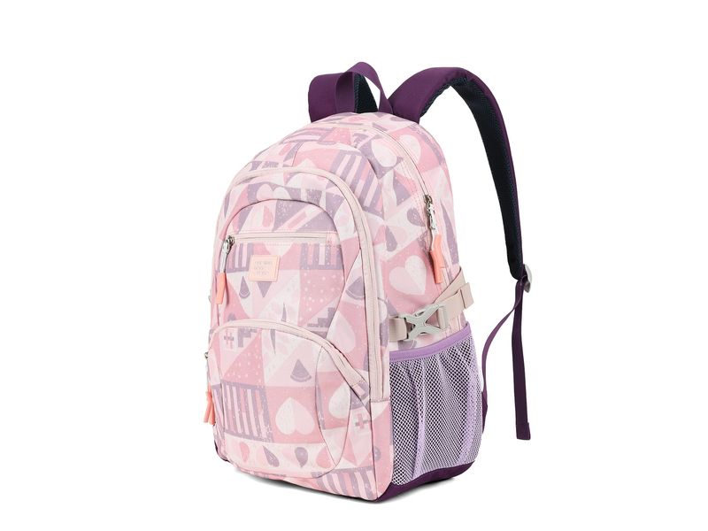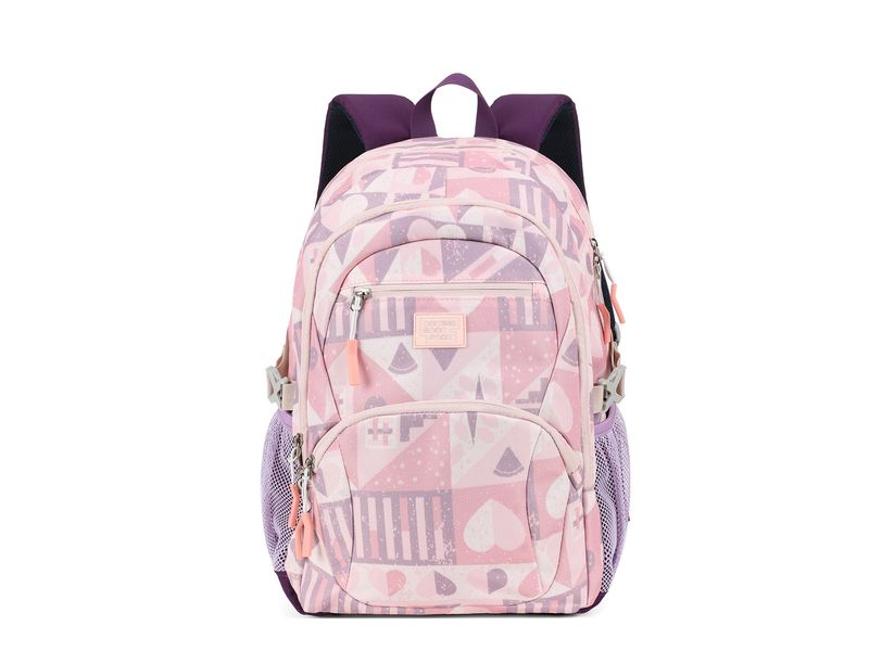 La parte posterior cuenta con un acolchado de malla de tres capas con canales de ventilación que favorecen la circulación del aire, manteniendo la espalda seca durante toda la jornada escolar.