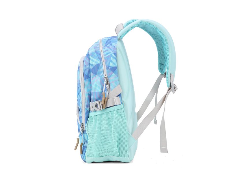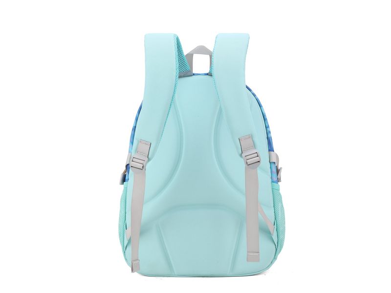 La parte posterior cuenta con un acolchado de malla de tres capas con canales de ventilación que favorecen la circulación del aire, manteniendo la espalda seca durante toda la jornada escolar.