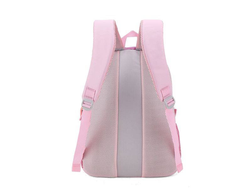 La parte posterior cuenta con un acolchado de malla de tres capas con canales de ventilación que favorecen la circulación del aire, manteniendo la espalda seca durante toda la jornada escolar.