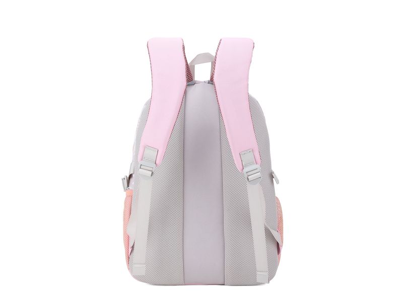 La parte posterior cuenta con un acolchado de malla de tres capas con canales de ventilación que favorecen la circulación del aire, manteniendo la espalda seca durante toda la jornada escolar.