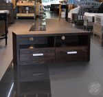 Mueble para TV tipo consola baja. Fabricado en melamina y agarradores de metal. Tiene dos gavetas y dos espacios para consolas y equipos variados. Viene con prácticos orificios para cableado. Medidas: alto48cm x ancho42cm x largo120cm