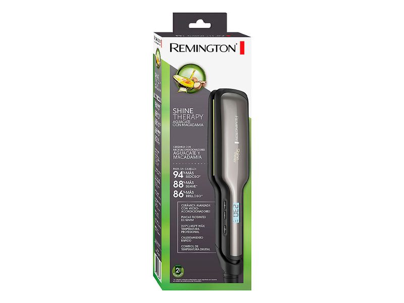 Medida de las placas 50 mm, ajustes de temperatura (+/-), temperatura máxima 230°c (450°f), calentamiento en 30 segundos, botón de encendido y apagado, pantalla digital, placas recubiertas de cerámica infundida con aguacate y macadamia, bloqueo de placas, apagado automático, placas flotantes, cable giratorio de 2 metros.