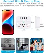 Extensor de salida multifunción: este extensor de enchufe de pared con 3 salidas de CA (15A/125V/1875W) y 4 puertos USB inteligentes de alimentación para teléfonos celulares, portátiles, cámaras y muchos otros dispositivos. Con protector de sobretensiones integrado (490J), puede garantizar que tus preciosos dispositivos estén bajo protección.