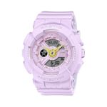Descripción: Reloj analógico-digital de la colección Baby-G con diseño inspirado en el estilo urbano y tonos lavanda suaves. Combina una estructura resistente a golpes con una construcción de resina duradera y cristal mineral. Incluye funciones prácticas como hora mundial, cronómetro, temporizador, 5 alarmas diarias y luz LED ámbar. Ligero, moderno y con resistencia al agua de 100 metros, ideal para un estilo activo y femenino.