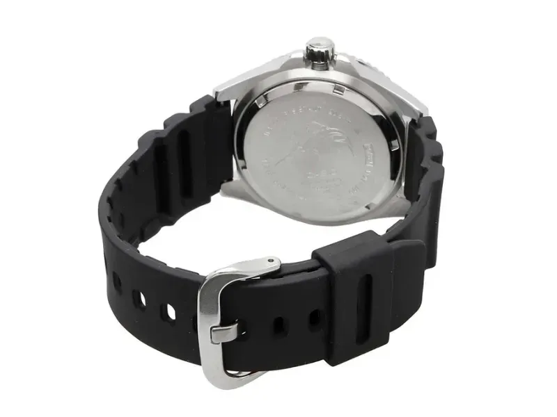-Forma del artículo: Redondo -Tipo de material de la esfera: Mineral -Tipo de pantalla: analógico -Broche: hebilla -Material del estuche: Acero inoxidable -Diámetro del estuche: 44 milímetros -Grosor del estuche: 12 milímetros -Material de la banda: plástico -Talla de banda: estándar para hombre -Ancho de la banda: 20 milímetros -Color de la banda: negro -Color del dial: negro -Material del engaste: Acero inoxidable -Calendario: fecha -Peso del artículo: 2.88 Onzas -Movimiento: Cuarzo Japones -Profundidad resistente al agua: 200 metros