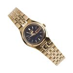Caja de acero inoxidable dorado Pulsera de acero inoxidable dorado Movimiento automatico Calibre: 4207 cristal mineral 21 joyas Esfera negra Día y fecha de visualización Corona Push / Pull Atornillar hacia atrás Doblar sobre el corchete Resistencia al agua 30M