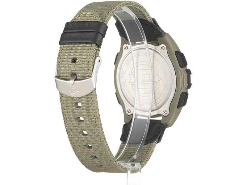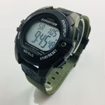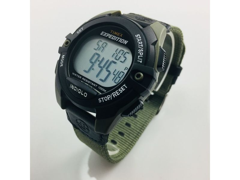 Descripción: Reloj digital Expedition con funciones de cronógrafo, alarma y temporizador, caja de resina verde de 41mm, correa de nylon verde de dos piezas e iluminación Indiglo®.